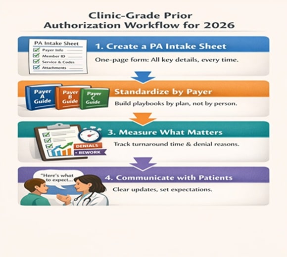 A clinic-grade prior auth workflow for 2026 starts with a one-page PA intake sheet (payer/plan, member ID, provider, codes, attachments, submission method + ref #) to create an auditable source of truth. Standardize by payer with mini playbooks, then track cycle times, denial reasons, and rework to fix bottlenecks. Use consistent patient messaging to set timelines, reduce frustration, and cut repeat “any updates?” calls.
